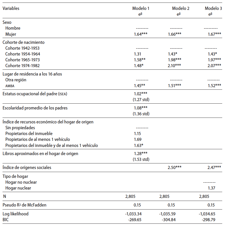 En este sentido, los distintos grupos de variables cuyo efecto se deseaba evaluar –factores adscriptivos e institucionales y de mérito– fueron incorporados progresivamente a un modelo base, en el cual se consideraron distintas medidas de origen social. La incorporación en modelos sucesivos de las variables “tipo de establecimiento educativo”, “tipo de hogar de origen”, etc., permitió evaluar hasta qué punto dichas variables median la relación entre orígenes sociales y logro.