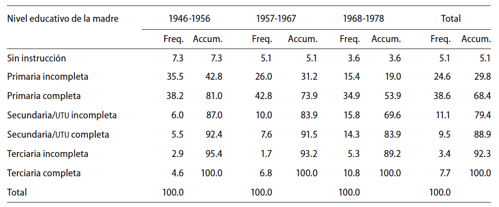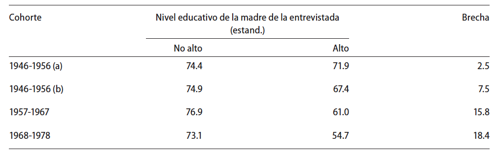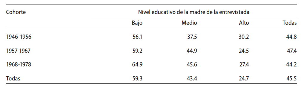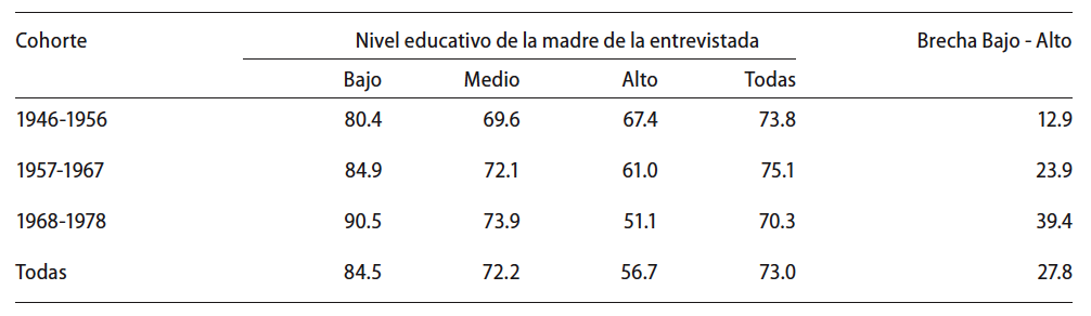 Los datos de la esf 2007-08 no permiten construir una variable de nivel educativo con estratos relativos que considere la distribución de los años promedio de escolarización de las madres de las entrevistadas para cada cohorte, dado que en la encuesta no se recogió información sobre años aprobados en cada uno de los niveles alcanzados. A pesar de las limitaciones, se construye una variable estandarizada que contempla la distribución de las mujeres por nivel educativo de la madre en cada cohorte, con la finalidad de apoyar el análisis descriptivo. Se trata de una variable binaria de nivel alto que considera las siguientes categorías: educación secundaria/UTU incompleta (o completa) y más, para la cohorte 1946-56; secundaria/UTU completa y más, para la cohorte 1957-67; y terciaria, para la cohorte 1968-78. De acuerdo con esta definición, en las dos cohortes más jóvenes las mujeres de nivel alto corresponden al 16% superior de la distribución; en el caso de la cohorte 1946-56 se utilizan dos opciones, de las cuales la primera (secundaria incompleta y más) agrupa al 19% y la segunda (secundaria completa y más) al 13% de las mujeres.