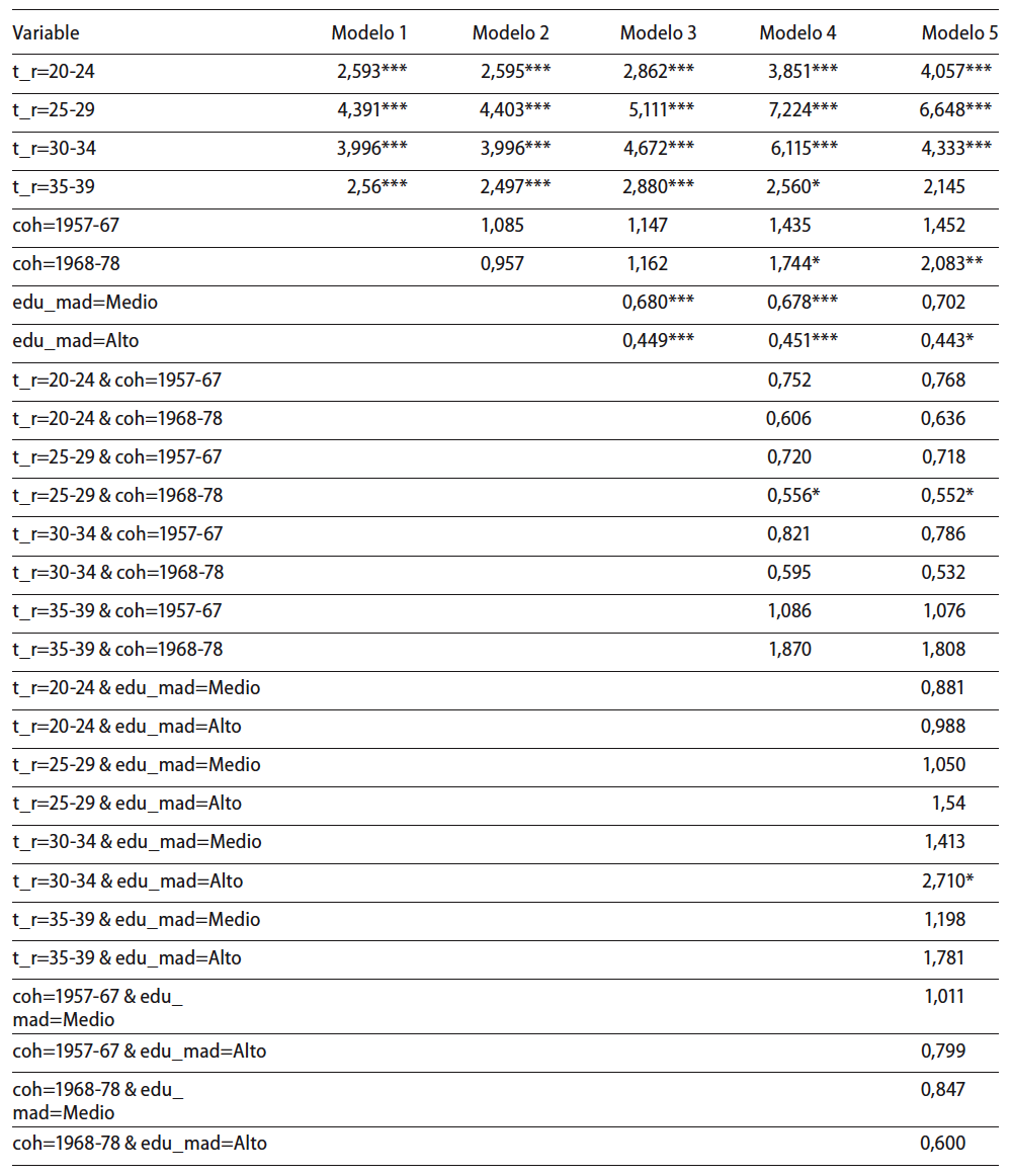 Finalmente, el Modelo 5 queda especificado con una interacción de tres sentidos entre las tres variables independientes. Como se observa en la Tabla 5, en el quinto modelo las razones de momio en t_r se mantienen significativas al tiempo que la razón de cambio entre el momio de nivel bajo y medio deja de ser significativa. El nivel de significación de la razón de momios en la cohorte 1968-78 aumenta y el del nivel alto disminuye. El valor de la razón de momios para el tramo 30-34 y la categoría alto del nivel educativo de la madre también resulta significativo, al igual que el de t_r=25-29 y coh=1968-78. El resto de las razones de momio estimadas no son significativas. Tal como ocurre con el Modelo 4, la interpretación de las razones de momios resulta altamente compleja, más aún por el hecho de que este modelo introduce nuevos efectos de interacción. Más adelante se realiza un ejercicio de simulación con el objetivo de poder interpretar los coeficientes estimados con el Modelo 5.