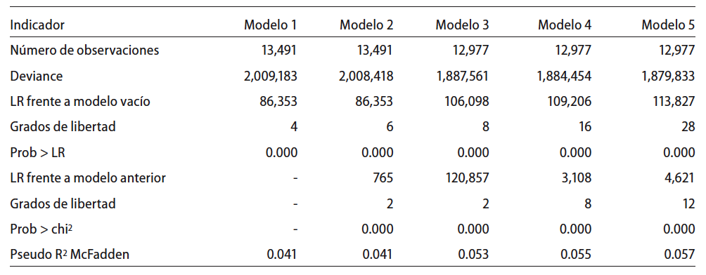 Para evaluar las mejoras en el ajuste de los sucesivos modelos, se utiliza el test de razón de verosimilitud (LR). Bajo la hipótesis nula de que las variables adicionales incluidas en el modelo no mejoran el ajuste del modelo, el estadístico LR sigue una distribución de chi-cuadrado con m grados de libertad, siendo m el número de variables adicionales incluidas. Si el LR es significativo, se rechaza la hipótesis nula, lo que implica que –siendo que el modelo anterior está anidado en el modelo ajustado– se prefiere el modelo ajustado al anterior (o al vacío) (Hosmer y Lemeshow, 2000; Bloosfeld y Rohwer, 2002). La bondad de ajuste global del modelo se evalúa a través del estadístico de pseudo R2 de McFadden.