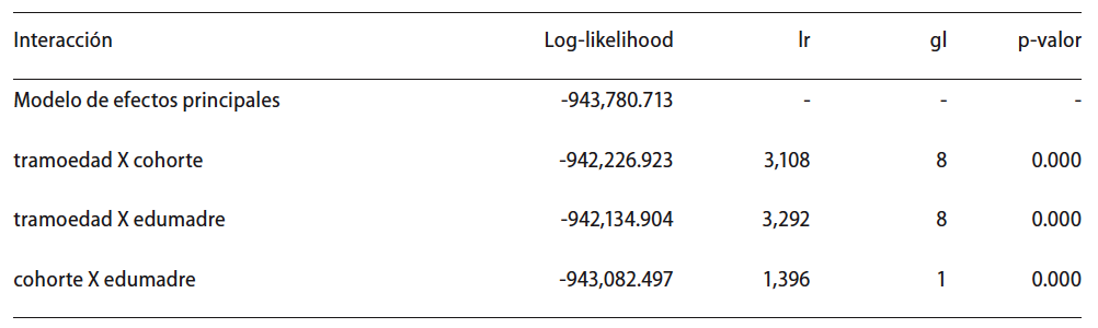 La estrategia para la selección del modelo final es la de “paso a paso” (stepwise), donde los bloques de variables son incluidos en el modelo de manera secuencial considerando en cada etapa su aporte al nuevo modelo en comparación con el modelo anterior (Hosmer y Lemeshow, 2000).10 A partir de esta estrategia, se especifica, en primer lugar, un modelo de efectos principales para analizar el efecto directo de las tres variables independientes sobre el logito de la probabilidad de experimentar la entrada a la maternidad a una edad determinada y, en segundo lugar, un modelo con efectos de interacción en tres sentidos: tramos de edad*cohorte, tramos de edad*educación de la madre y cohorte*educación de la madre. Existen dos razones desde el plano teórico por las cuales se propone un reajuste del modelo de efectos principales hacia otro con interacciones. El primer argumento responde a la necesidad de relajar el “supuesto de proporcionalidad de momios”, que establece que los efectos de una o más variables independientes son los mismos para todas las edades consideradas (véase Solís, 2009). Dado que uno de los objetivos del trabajo consiste en revisar si las nuevas cohortes de mujeres postergan el inicio de la fecundidad hasta edades más avanzadas, el modelo especificado debe permitir discernir entre los efectos de la cohorte de nacimiento que ocurren a edades tempranas y los efectos que ocurren en los tramos de edades más tardías. En segundo lugar, y vinculado con el otro objetivo del documento, se intenta identificar si la existencia (o no) de cambios observados entre las mujeres de distintas cohortes responde, a su vez, a un proceso de polarización del comportamiento reproductivo intracohorte. Por ese motivo, se propone también introducir efectos de interacción entre cohorte y nivel educativo de la madre, asumiendo que los efectos de la cohorte en las probabilidades condicionadas de ocurrencia del evento están moderados por el estrato social de pertenencia.