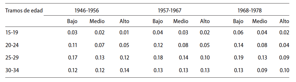 Como se observa en la mencionada Tabla 3a, la brecha que se presenta entre los niveles bajo y alto en la cohorte 1946-56 (12.9 puntos porcentuales) se incrementa en las cohortes 1957-67 (23.9 puntos porcentuales) y 1968-78 (39.4 puntos porcentuales). En este sentido, podría afirmarse que la ausencia de modificaciones sustantivas entre cohortes de nacimiento en la edad al primer hijo se debe a un efecto de “contrapeso” que se explica por dos procesos de dirección opuesta: por un lado, el aumento de la proporción de mujeres de estratos bajo y medio que transita a la maternidad tempranamente y, por el otro, la postergación del inicio de la fecundidad para después de los 30 años entre las mujeres pertenecientes al estrato alto. No obstante, un aspecto a tener presente en este análisis es que la distribución de las mujeres por estrato social también se va modificando con las cohortes más recientes por efecto del aumento de los años de escolarización en la población femenina. La proporción de mujeres de estrato bajo, por ejemplo, pasa del 42.8% en la cohorte 1946-56 al 19.0% en la cohorte 1967-78.