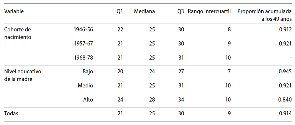 Un cuarto antecedente en la materia es el trabajo de Cabella (2009). A partir de una comparación entre las estadísticas de nacimientos de 1993 y 2004, la autora afirma que, si se considera a las mujeres en su conjunto, no se observa una tendencia a retrasar la edad al primer hijo en Uruguay. Esto se explica porque los estímulos para rezagar la maternidad han influido profundamente en la decisión del momento de inicio de la etapa reproductiva entre las mujeres más educadas, mientras que no se advierten cambios en la edad a la maternidad entre las que no terminaron la enseñanza secundaria.