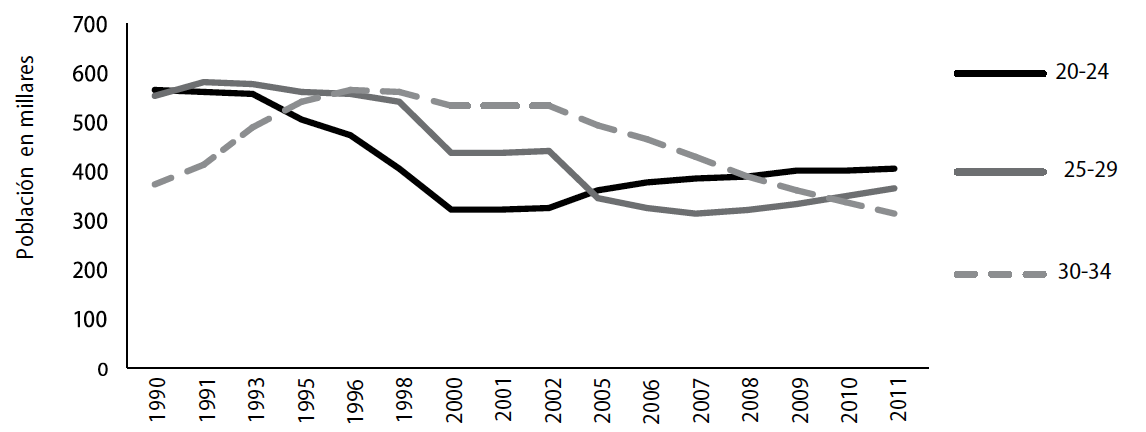 En el Gráfico 9 se puede observar la tendencia a la caída de las mujeres en edad reproductiva de los grupos de 30-34 y 25-29, aunque en este último se registra una ligera recuperación. Por su parte, a partir del año 2002, se aprecia un incremento en el grupo de mujeres de 20-24 años. No obstante, los niveles poblacionales alcanzados por estos grupos en la década del noventa serán muy difíciles de igualar, sobre todo si se toma en consideración la proyección de la población 2011-2035 realizada por la ONE, en la cual se observa una constante disminución de los grupos de edades antes analizados, excepto un ligero crecimiento hacia 2020 y 2025 en el grupo de edad de 30-34 años.