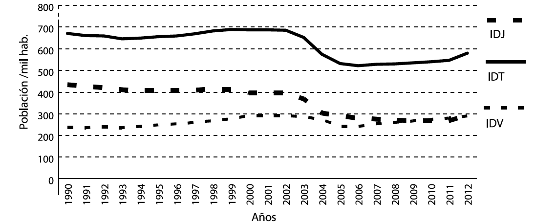 Dos son los indicadores de dependencia más utilizados: la dependencia de los niñosjóvenes (0-14 años) y la dependencia de vejez (60 y más años). El índice de dependencia total, que suma los dos anteriores, da una visión más completa. El Gráfico 10 ilustra estos índices en el período analizado.