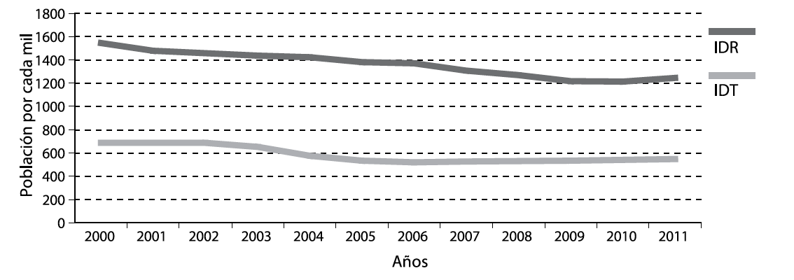 En el Gráfico 11 se puede apreciar que, si se considera el Índice de Dependencia Total, mil trabajadores debían soportar 687 inactivos en 2000 y 547 en 2011; pero, si se toma en cuenta el Índice de Dependencia Real –que incluye también a los desempleados–, aumenta el peso significativamente: en 2000, mil trabajadores ocupados debían soportar 1,545 inactivos, y, en 2011, 1,245. A pesar de que la tendencia es decreciente, los datos son preocupantes, porque los índices de fecundidad no presentan una verdadera recuperación y se mantienen por debajo de los niveles de reemplazo.
