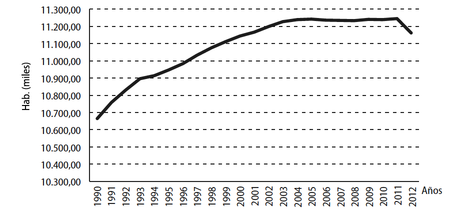 La población total de Cuba en 1990 era de algo más de diez millones de habitantes (10,662,148). Diez años más tarde, en 2010, apenas sobrepasaba los once millones (11,241,161), lo cual da un incremento del 5.4%, valor que se considera expresión de un crecimiento lento (ONE, 2011). El Gráfico 1 muestra la evolución de la población en las últimas dos décadas.