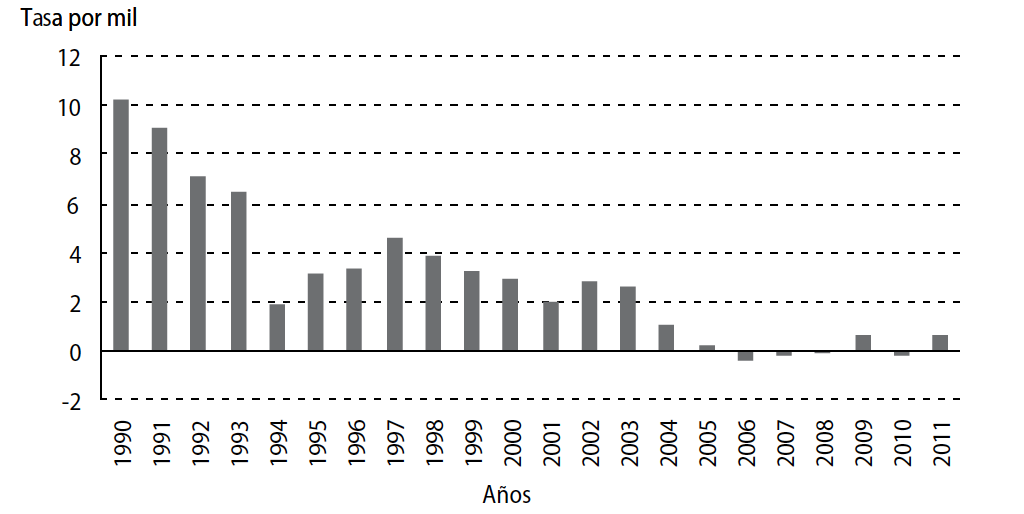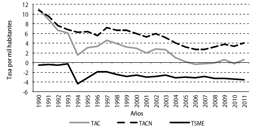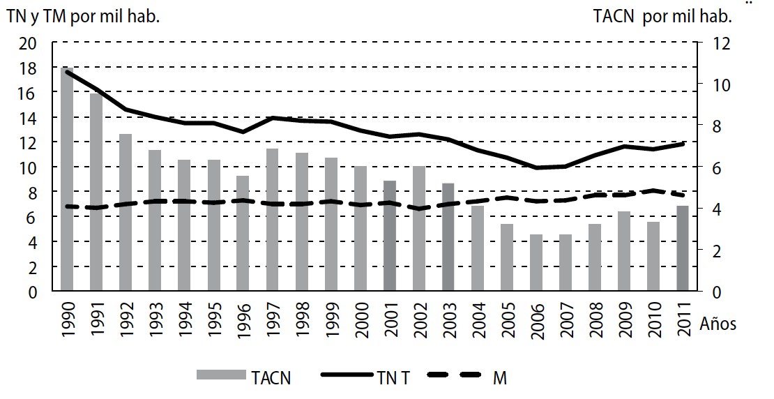 Lo primero que debe leerse es la tendencia de las barras, que ilustra sobre la evolución de la TACN. En 1991, por primera vez, la TACN cae a 9.5 cada mil habitantes, ya que durante toda la década del ochenta había estado por encima de los 10 por mil. Debe observarse que, salvo pequeños lapsos de recuperación (1997, 2002, 2009 y 2011), la tendencia es siempre decreciente, llegando en 2006-2007 al punto más bajo, con un crecimiento natural de 2.7 cada mil habitantes. A partir de 2008, se muestra un movimiento oscilatorio, con caídas y recuperaciones, que no expresa una tácita tendencia al crecimiento.