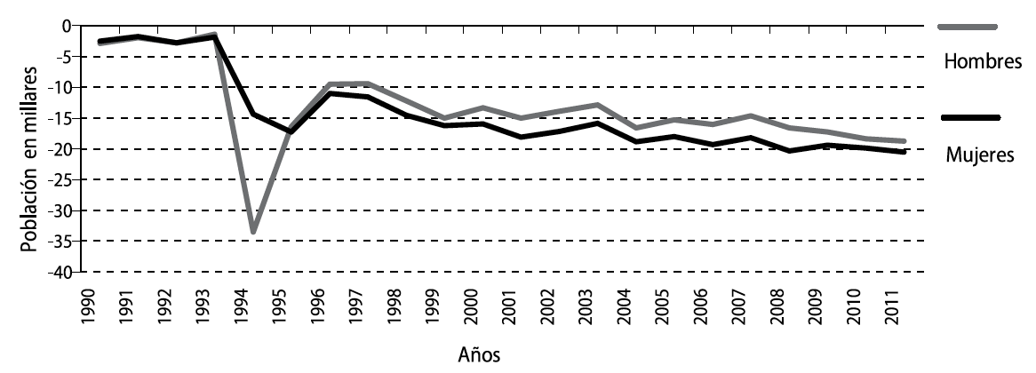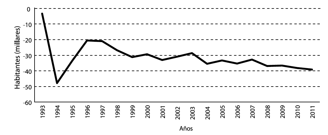 Al observar el gráfico, lo primero que percibimos es la tendencia ascendente del Saldo Migratorio Externo (SME). A partir de 1990 y hasta 1993 (período que no se representa en la gráfica), la emigración se había comportado en el orden de 5 mil personas anuales, aproximadamente. Sin embargo, en la misma medida que se profundizaba el “Período especial”, aumentaba la emigración. La “crisis de los balseros” en 1994 provocó una sangría en la población de 47,844 emigrados. Este saldo comenzó a decrecer muy lentamente hasta alcanzar su nivel más bajo en 1996 con 20, 552 efectivos de población. A partir de este momento, manifiesta un carácter persistente de crecimiento constante hasta alcanzar su máximo nivel en 2011 con la migración de 39,263 personas.