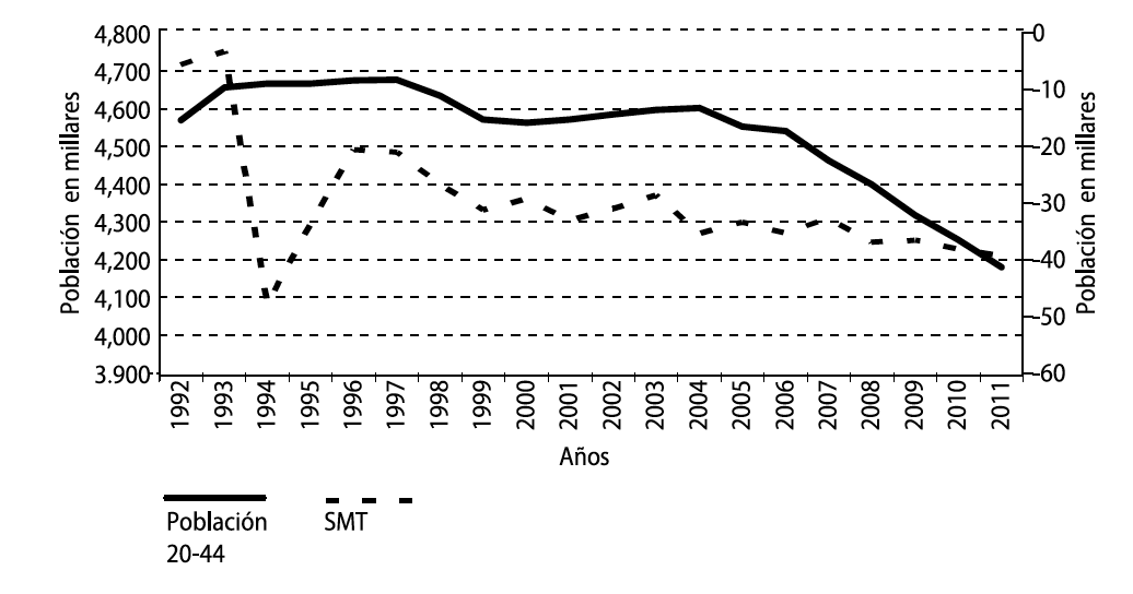 Gráfico 6. Comparación de la evolución del grupo de edad 20-44 y el Saldo Migratorio Total (SMT). Cuba. Años 1992-2011