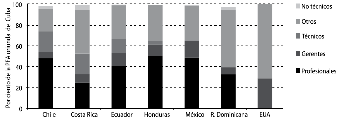 El Gráfico 7 presenta el porcentaje de población cubana ocupada, según su actividad, del total de la PEA en los países escogidos. Obsérvese que la categoría profesionales es dominante en la mayoría de los países graficados, seguida de otras ocupaciones (Otros) en la cual se agrupan ocupaciones como: prestadores de servicios, agricultores, obreros y artesanos, operadores, funcionarios de seguros, etc. En 2006, la presencia de profesionales, en la mayoría de los países seleccionados, se encuentra sobre el 40% del total de la población cubana ocupada: Chile 48.2% de 2,005 ocupados; Costa Rica 25.1% de 2,496 ocupados; Ecuador 40.7% de 836 registrados como ocupados; Honduras 49.8% de 289 cubanos ocupados; México 48.3% en una población de 3,512 cubanos ocupados; República Dominicana 32.6% de profesionales cubanos dentro de 1,493 personas de la población cubana clasificada como ocupada. Por último, en los EUA, según los datos utilizados, la población cubana ascendía a 408, 140 ocupados, no encontrándose clasificación de profesionales; sin embargo, la población agrupada dentro de la categoría de gerentes ascendía a 28.9%, con un 27.6% de empleados y resto en otras ocupaciones.