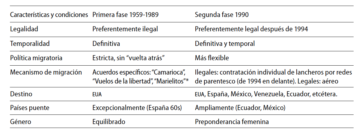 En Cuba la emigración tiene características muy peculiares. En determinados períodos, circunstancias específicas impulsan la migración, la cual se presenta en forma de oleadas o picos. La migración cubana posrevolucionaria se puede dividir, según nuestra consideración –y a diferencia de lo que sostienen otros autores (Hernández, 1987: Miyar, 1988: Lobaina, 1995; Aja, 2009) que toman como base las olas migratorias–, en dos grandes períodos separados por la caída del régimen de la ex Unión Soviética, que trajo notables implicaciones para la dinámica económica, política y social de Cuba.