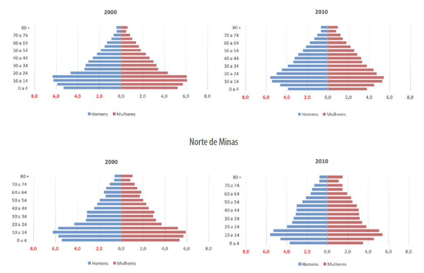 Em 2000, nas duas regiões, nota-se um aumento sucessivo da participação dos grupos de 0 a 4 até 15 a 19 anos, devido aos efeitos da queda da fecundidade. A partir de 20 anos há uma nítida forma piramidal, bem mais estreita que as idades inferiores, um caso típico de perdas populacionais ocorridas em décadas anteriores, uma vez que, como visto anteriormente, o Brasil e Minas Gerais passam por acelerado processo de envelhecimento.