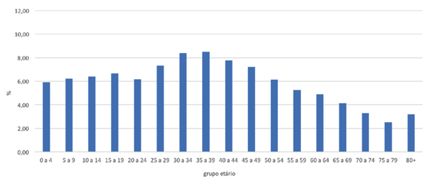 Quanto à estrutura etária, fica evidente no Gráfico 3 a grande proporção da população em idade ativa – compreendida entre 15 e 64 anos, um período conhecido como “janela de oportunidades” ou de “bônus demográfico”, devido à diminuiçã da participação de pessoas em idades economicamente inativas, neste caso, de crianças.