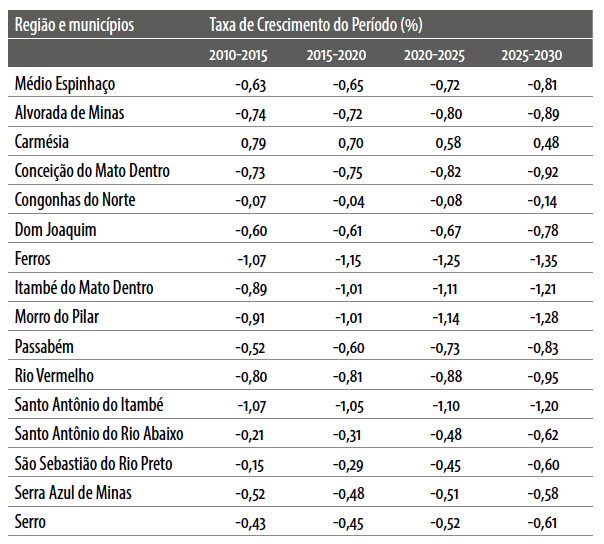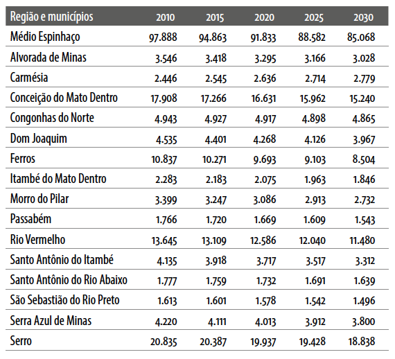 A diminuição da população da região Médio Espinhaço ocorrerá a um ritmo cada vez mais intenso, de -0,63% ao ano, entre 2010 e 2015, para -0,81% a.a., entre 2025 e 2030, como pode ser observado na tabela 5. Conceição do Mato Dentro, Ferros, Rio Vermelho e Serro são os maiores responsáveis pela tendência demográfica esperada, uma vez que estão entre aqueles de maior porte populacional, bem como entre os que apresentam mais forte ritmo de decréscimo (com exceção de Serro, cujo decréscimo fica abaixo da média regional). A importância do comportamento desses municípios fica ainda mais evidente ao se considerar que a população dos quatro, conjuntamente, deverá passar de aproximadamente 63 mil habitantes para 54 mil, entre 2010 e 2030.
