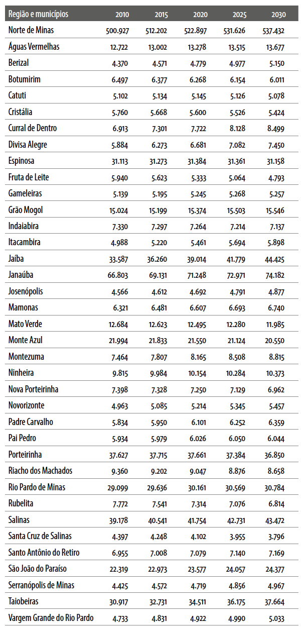 De maneira bem diferente do Médio Espinhaço, internamente os municípios do Norte de Minas apresentam comportamentos diferenciados, com ampliação da população na maioria dos seus municípios. No horizonte de projeção, os aumentos mais expressivos tendem a ocorrer em algumas localidades de maior porte populacional, com destaque para Jaíba, Janaúba e Taiobeiras, nesta ordem. Apesar do provável crescimento populacional, as projeções apontam para uma tendência de diminuição em 12 deles, sendo a mais expressiva em Monte Azul.