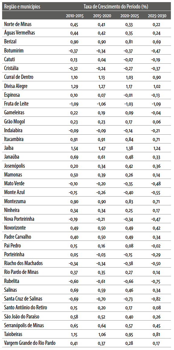 Fonte: Projeções elaboradas pelo Cedeplar/ufmgTabela 8: Taxa geométrica de crescimento médio anual. Região Norte de Minas, 2010-2030