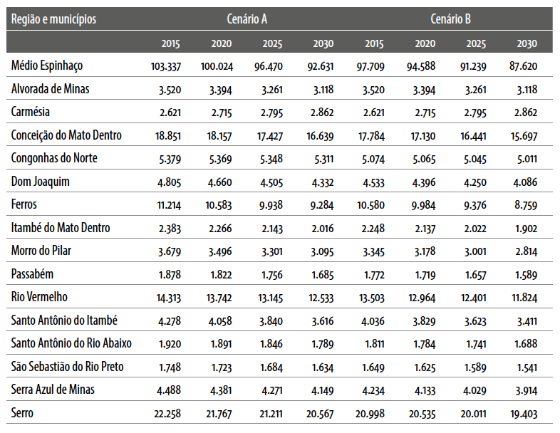 Comparando-se o cenário A com o B, a diferença na variação do emprego é praticamente inexistente na maioria dos municípios da Região Médio Espinhaço, exceto em Morro do Pilar (uma variação 63,7% superior ao cenário B, no período 2010-2030, a maior delas), Conceição do Mato Dentro, Dom Joaquim, São Sebastião do Rio Preto e Serro. Por isso, nestes quatro últimos o acréscimo populacional considerado foi de 6,0%, enquanto no primeiro correspondeu a 10,0%. Nos demais, a variação permanece em 3,0%, tal como no cenário tendencial.