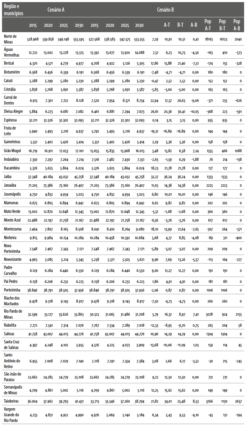 Para o Norte de Minas, a variação do emprego formal no cenário A praticamente não se difere daquela do cenário B, exceto nos municípios de Rio Pardo de Minas (uma variação 93,1% superior ao cenário B, no período 2010 a 2030, a maior delas), Taiobeiras e Grão Mogol. Nestes municípios o acréscimo populacional deverá ser de 10,0%, continuando 3,0% nos demais. Entretanto, no cenário A, muitas localidades da microrregião de Salinas tenderão a apresentar uma variação negativa quando comparada com o cenário B, portanto, está implícita uma relativa polarização do poder de atração na região Norte de Minas. Assim, estes municípios continuarão com a mesma população do cenário tendencial, pois não se espera acréscimo adicional.8