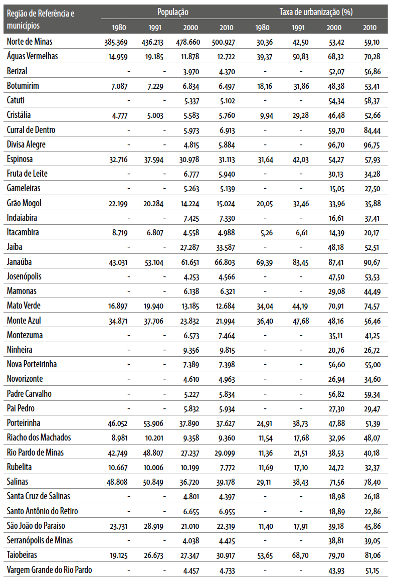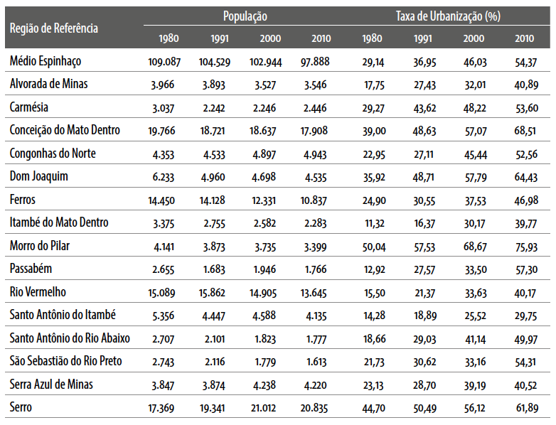 As regiões apresentavam graus de urbanização bastante baixos para os padrões brasileiros. No Médio Espinhaço, a população urbana só ultrapassou a rural no Censo de 2010 (para o Brasil como um todo, isso ocorreu em 1970), ao passo que na região Norte de Minas isso ocorreu em 2000. Enquanto a taxa de urbanização do estado de Minas Gerais correspondia a mais de 85,0%, em 2010, a da primeira região era de apenas 54,4% e a da segunda registrava 59,1% (tabelas 1 e 2).