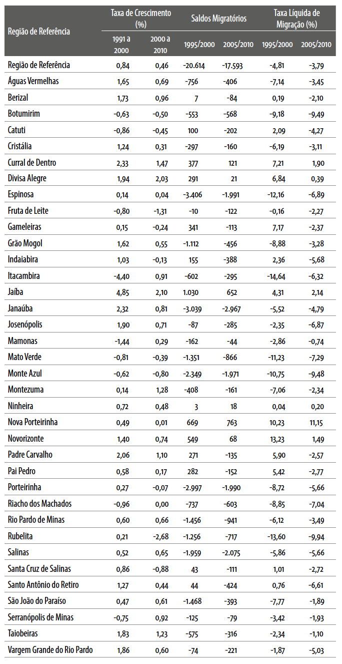 No Norte de Minas havia municípios com taxas de crescimento demográfico médio que iam de -4,4% a.a., em Itacambira, no período 1991-2000, até 2,1% a.a., em Jaíba, entre 2000 e 2010. É evidente que os municípios da região Norte de Minas também tiveram crescimento demográfico bem abaixo das médias brasileira e mineira, uma vez que grande parte deles apresentou taxas até mesmo negativas. Estes dados sugerem que as duas regiões não foram capazes de sustentar nem mesmo o crescimento natural de sua população.