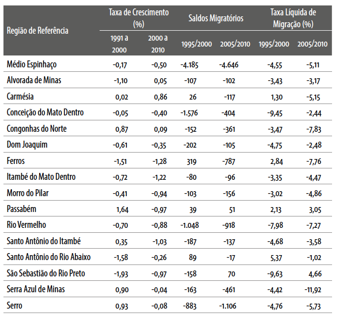 A migração confirma o quadro geral das taxas de crescimento. Na região Médio Espinhaço, os saldos líquidos passaram de -4,2 mil pessoas, no período 1995-2000, para 4,6 mil em 2005-2010. Estas perdas líquidas são explicadas, em grande parte, pelo caso de Conceição do Mato Dentro, no primeiro período (-1,6 mil pessoas), correspondente a 9,5% da sua população recenseada em 2000, e pelo município de Serro, no segundo quinquênio, quando apresentou um saldo migratório, também negativo, de 1,1 mil pessoas. Estes são os municípios mais populosos da região.