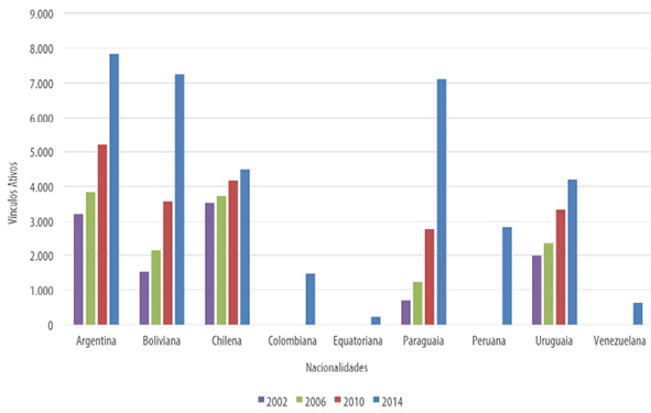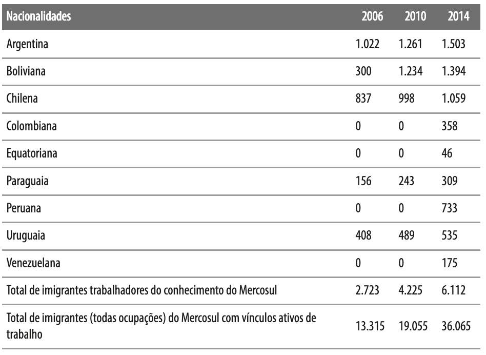 Fonte: Ministério do Trabalho e Previdência Social. Relação Anual de Informações Sociais – Rais; Observatório das Migrações em São Paulo (Fapesp-CNPq /Nepo-Unicamp)Os vínculos ativos de imigrantes trabalhadores do conhecimento do Mercosul no Brasil, apesar do crescimento médio de 9,39% ao ano em números absolutos, apresentaram uma queda relativa de sua participação no total de imigrantes dessas nacionalidades no país entre 2006 e 2014, sobretudo a partir de 2010: de 20,45% em 2006 (2.723 em 13.315), para 16,95% em 2014 (6.112 em 36.065). De fato, o estudo da imigração internacional dos países do Mercosul para o Brasil envolve uma diversidade de movimentos migratórios em curso, conforme discutido por Oliveira et al. (2016, p. 20), como o aumento dos fluxos e da inserção laboral no Brasil de imigrantes do Mercosul com menor nível de escolaridade após a adoção do Acordo de Residência.