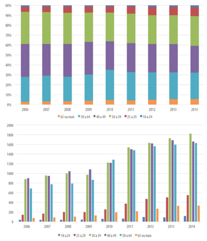 O Gráfico 2 apresenta a distribuição dos vínculos ativos dos imigrantes trabalhadores do conhecimento do Mercosul no mercado de trabalho formal brasileiro, segundo grupos etários. Nota-se que a maior parte dos vínculos encontra-se distribuída entre as idades de 30 a 64 anos, sendo observada uma tendência ao rejuvenescimento desta estrutura etária, com o aumento da participação de vínculos de empregos formais para imigrantes mais jovens, de 25 a 29 anos, no período.