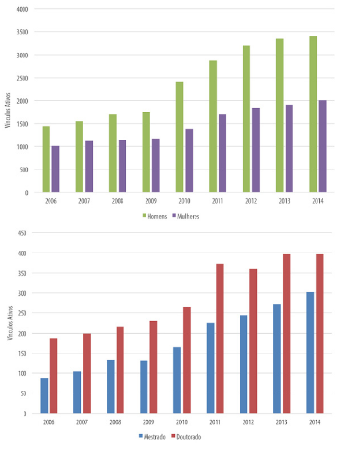 Ressalte-se que somente a partir de 2006 é possível identificar na Rais o vínculo ativo do emprego, a nacionalidade do trabalhador (informações que já existiam) e o nível de instrução separado por mestrado e doutorado. Desse modo, selecionamos os anos de 2006, 2010 e 2014 para este estudo, partindo do início da série de informações que apresenta a variável “grau de instrução” separado por mestrado e doutorado (2006), um ano intermediário (2010) e o último ano disponível da série, quando da elaboração do artigo (2014).