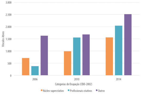 Fonte: Ministério do Trabalho e Previdência Social. Relação Anual de Informações Sociais – Rais; Observatório das Migrações em São Paulo (Fapesp-CNPq /Nepo-Unicamp).Destaca-se, ainda, o alto número de vínculos relativos aos analistas de sistemas computacionais em comparação às demais ocupações próprias do núcleo duro dos trabalhadores do conhecimento. Em 2006, essa participação foi de aproximadamente 25% dos registros dessa categoria, ou seja, 179 vínculos ativos de um total de 711, enquanto em 2014 houve um aumento de quase 31%, com 477 vínculos ativos de 1.557. Algumas ocupações tiveram acrescidos seus vínculos absoluta e relativamente entre 2006 e 2010, são elas: arquitetos; engenheiros de minas; profissionais do jornalismo; profissionais da informação; e desenhistas industriais. No entanto, outras aumentaram seus vínculos ativos entre 2006 e 2014, mas perderam participação no total da categoria, tais como engenheiros civis, eletrônicos, mecânicos e de produção. Os profissionais de relações públicas, publicidade, mercado e negócios, por sua vez, apresentaram a maior queda no número de vínculos ativos entre 2010 e 2014, diminuindo sua participação no núcleo supercriativo, que passou de 11% com 105 registros, para 5,7%, com 83.