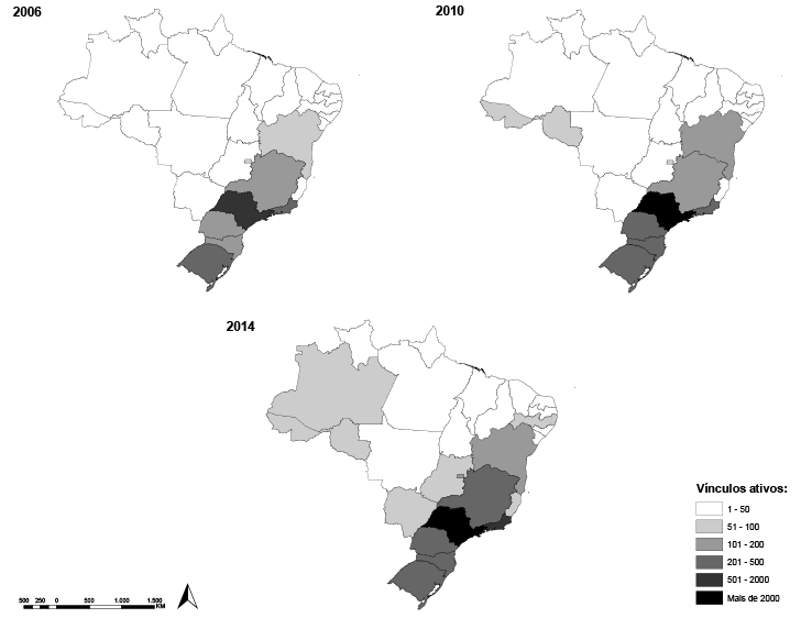 O Mapa 1 apresenta a distribuição espacial dos vínculos dos imigrantes trabalhadores do conhecimento advindos dos países-membros e associados ao Mercosul, segundo estados da federação, para 2006, 2010 e 2014. É possível notar, para os três anos considerados, uma alta concentração dos registros administrativos nas regiões Sudeste e Sul, com destaque para o Estado de São Paulo, que passou de 1.218 vínculos, em 2006, para 2.125, em 2010, e atingiu seu auge em 2014, com 2.939 de trabalhadores do conhecimento do Mercosul. Observa-se também, nessas duas regiões, o aumento no número de vínculos, entre 2006 e 2014, para os Estados de Minas Gerais (de 153 para 241), Espírito Santo (de 27 para 53) e Paraná (de 154 para 375).