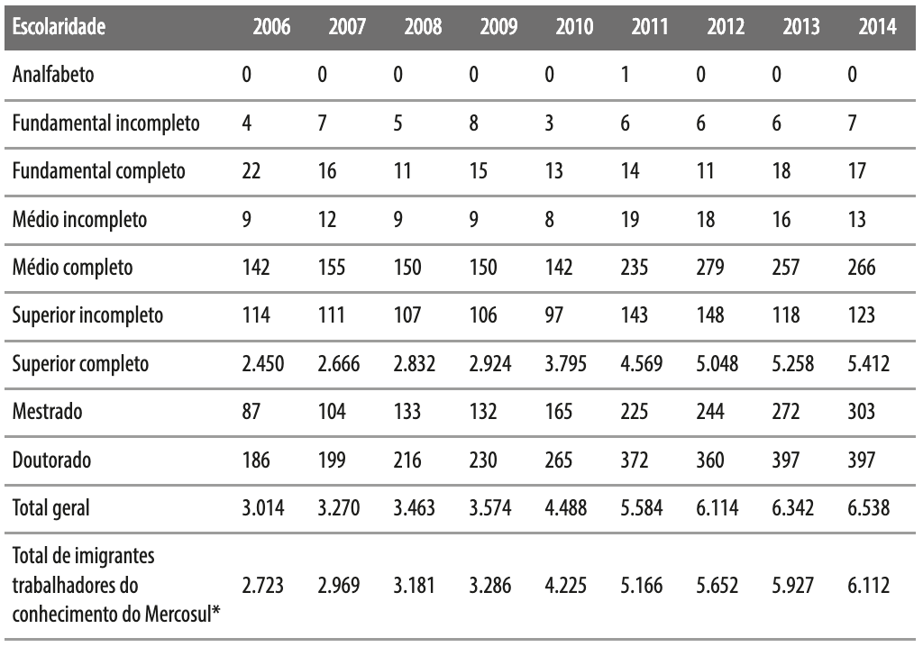 Os imigrantes trabalhadores do conhecimento do Mercosul inseridos no mercado formal de trabalho podem ser caracterizados também por seu alto nível de escolaridade e pelas ocupações que exercem (Mello, 2007; Florida, 2014). Contudo, é significativa a discussão acerca do “desperdício de cérebros” (Ozden, 2006), uma vez que nem sempre a sociedade receptora dá condições ao imigrante, mesmo com alta escolaridade, de se inserir em ocupações equivalentes ao seu tempo de estudo.