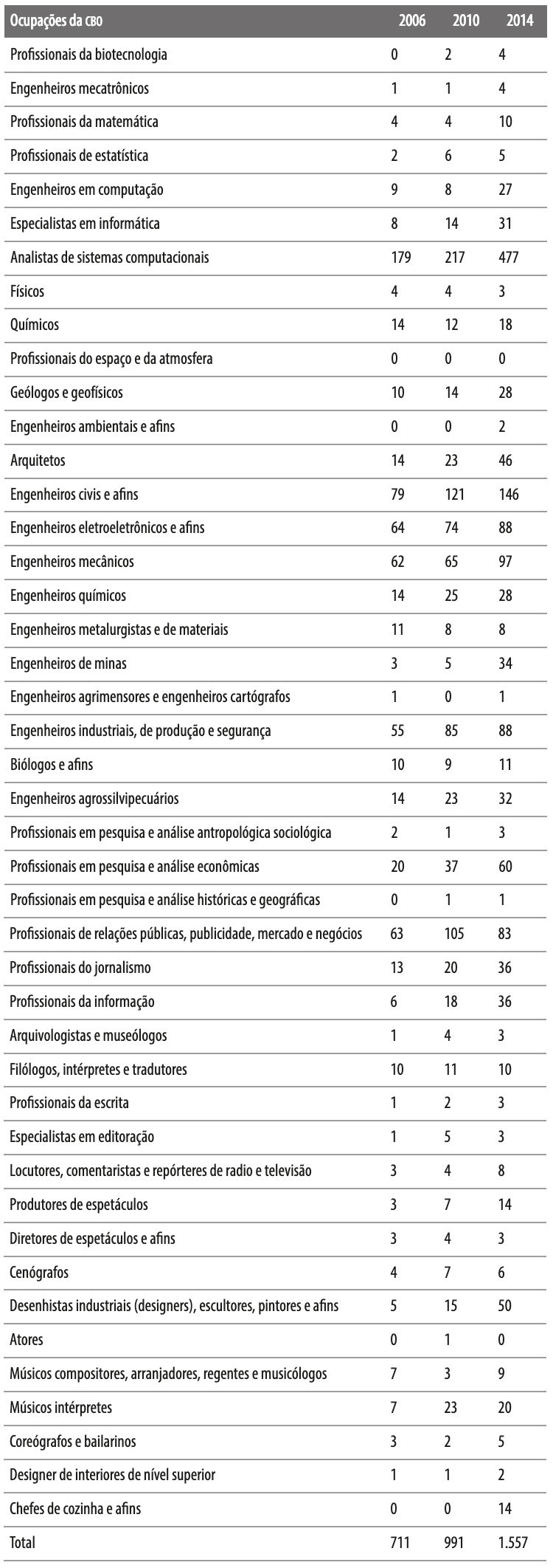 Fonte: Mello (2007); Código Brasileiro de Ocupações (CBO, 2002); Florida (2004, 2014)Com o objetivo de compreender como a migração internacional desse grupo de trabalhadores do conhecimento do Mercosul tem se apresentado no Brasil, foram utilizadas as informações do mercado de trabalho formal contidas na Rais de 2006 a 2014.