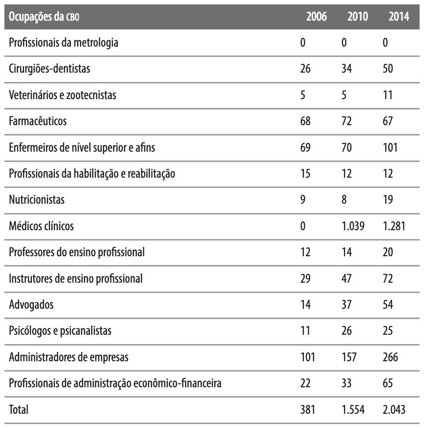 Na Tabela 4, que apresenta os dados dos vínculos ativos de ocupações referentes à categoria de profissionais criativos, entre 2010 e 2014, observa-se o predomínio dos registros relacionados aos médicos clínicos.15 Não obstante, ainda que em números absolutos os vínculos dessa ocupação tenham aumentado, passando de 1.039 para 1.281, no período analisado,16a participação desses médicos no total de profissionais criativos reduziu-se de aproximadamente 66,9%, para 62,7%. Mesma situação é verificada para os vínculos referentes aos administradores de empresas, que passaram de 101 para 266, mas cuja participação no total de registros de profissionais criativos diminuiu de 22,5% para 13%, entre 2006 e 2014. Devem-se destacar também outras ocupações, como os farmacêuticos, que passaram de 17,9% de participação para 3,3%, ou seja, de 68 em 381, para 67 em 2.043, no período estudado, além dos enfermeiros de nível superior e afins (de 69 em 381 para 101 em 2.043) e dos cirurgiões-dentistas (de 26 em 381 para 50 em 2.043).