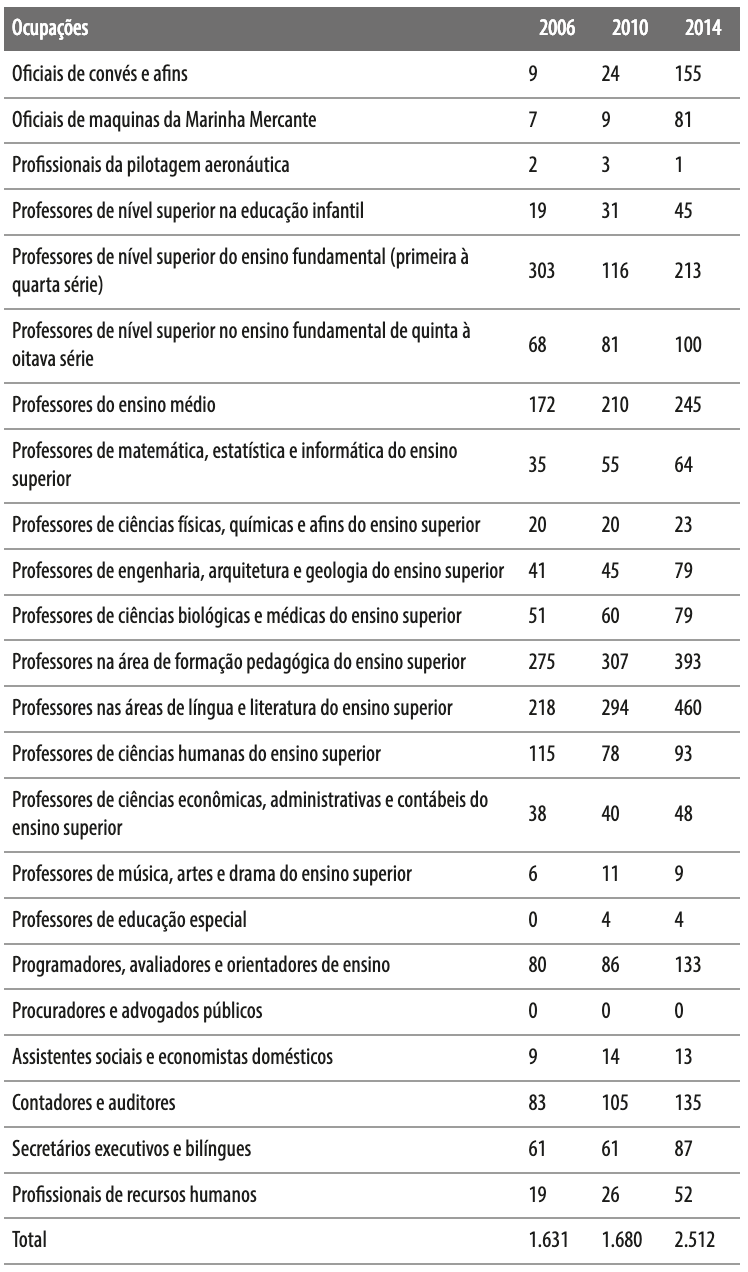 Fonte: Ministério do Trabalho e Previdência Social. Relação Anual de Informações Sociais – Rais; Observatório das Migrações em São Paulo (Fapesp-CNPq /Nepo-Unicamp).Já a Tabela 5 apresenta os vínculos ativos de imigrantes inseridos nas ocupações referentes à categoria outros profissionais do conhecimento. Observa-se que praticamente todas as ocupações obtiveram aumento no número de vínculos, passando de um total de 1.631, em 2006, para 1.680, em 2010, e finalmente atingindo 2.512 vínculos ativos, em 2014, ou seja, um crescimento de aproximadamente 54%. Destacam-se os registros referentes aos professores que atuam na área de formação pedagógica do ensino superior, ocupação com maior número de vínculos ativos para o grupo outros profissionais, em 2006 – ainda que tenha perdido participação ao longo do período analisado, passando de 16,9% (275 em 1.631) para 15,6% (393 em 2.512) do total dessa categoria – e aos professores de língua e literatura do ensino superior, visto que sua representatividade ampliou-se de 13,4% (275 em 1.631) para 18,3% (460 em 2.512), entre 2006 e 2014. Ademais, cabem ressaltar os vínculos próprios dos oficiais de convés e afins, que representavam aproximadamente 0,6% do total da categoria outros profissionais (9 de 1.631) e passaram para 6,2% (155 de 2.512); dos oficiais de máquinas da Marinha Mercante, que aumentaram de 0,4% (7 em 1.631) para 3,2% (81 em 2.512); e dos contadores e auditores (83 de 1.631 para 135 de 2.512), entre 2006 e 2014.