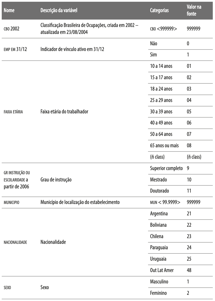 Para identificar os imigrantes qualificados trabalhadores do conhecimento foram selecionadas as seguintes variáveis (Quadro 2): emprego em 31/12; faixa etária; grau de instrução a partir de 2006; municípios por Unidades Federativas (uf); nacionalidade; e sexo.