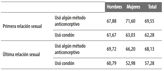(Varones: n = 6,366 y mujeres n = 7,061) Fuente: cálculos propios a partir de enessaep 2014Por último, en cuanto de la actitud al uso, exploramos el uso que hicieron los adolescentes ya iniciados sexualmente, del uso de algún método anticonceptivo y del condón en particular, en su primera y en su última relación sexual.