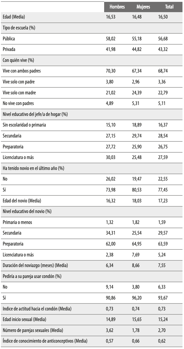 Los datos permiten identificar que la edad media de los adolescentes de esta muestra está en torno a los 16 años y que la mayor proporción de ellos asiste a escuelas públicas (57%), vive con ambos padres (69%) y el jefe de su hogar (casi siempre el padre) tiene en la mayoría de los casos un nivel educativo de secundaria o más.