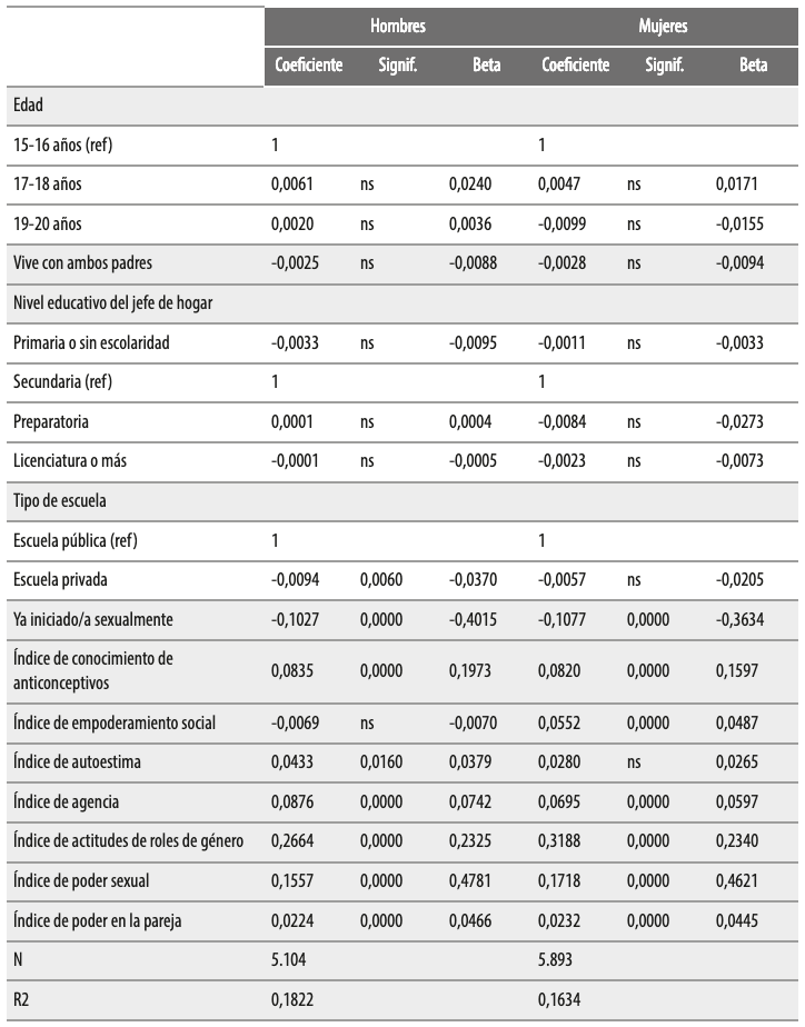 Fuente: cálculos propios a partir de enessaep 2014Para examinar el papel que juega el empoderamiento de los adolescentes en sus actitudes hacia el uso del condón, estimamos dos modelos de regresión (uno para varones y otro para mujeres), empleando como variable dependiente el índice de actitudes hacia el condón que describimos previamente. Este índice está estandarizado, con valores que van de cero a uno: mientras mayor es el valor en el índice, más positiva es la actitud de los jóvenes hacia el uso de anticonceptivos. Estos modelos incluyen a todos los jóvenes de la muestra, tanto los no iniciados como los ya iniciados sexualmente, dado que las preguntas sobre actitudes hacia el condón se plantearon para todos.