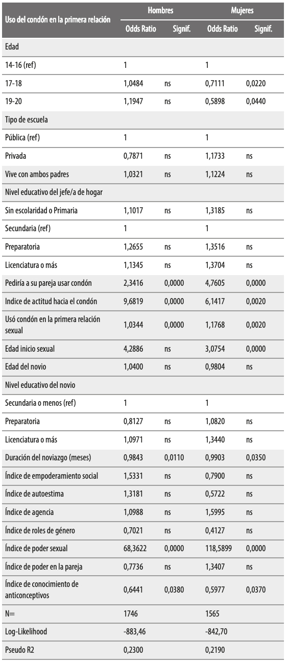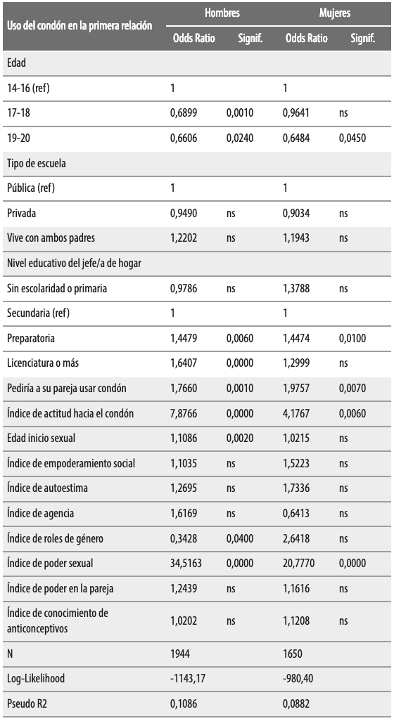 El hecho de que los jóvenes consideren que sí le pedirían a su pareja que usase el condón durante una relación sexual arroja una asociación significativa con el uso del condón en la primera relación tanto para mujeres como para los hombres: la razón de probabilidad de usar el condón se incrementa en 98% para las mujeres y 77% para los varones comparados con aquellos jóvenes que no le pedirían el uso del condón a su pareja.