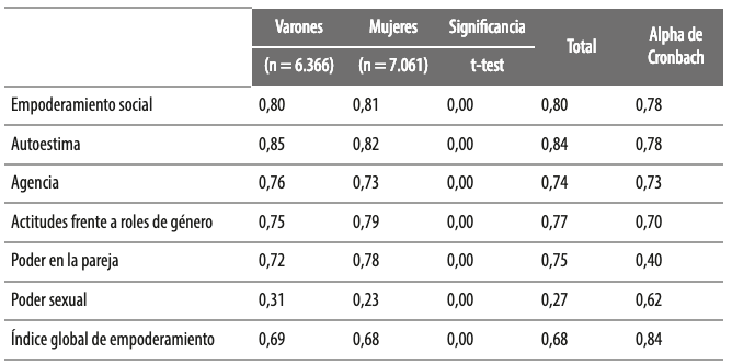 Al comparar los valores medios para mujeres y varones se observa que los varones evidencian mayores niveles de empoderamiento en términos de autoestima, agencia y poder sexual, mientras que las mujeres muestran valores más elevados en cuanto a empoderamiento social, actitudes (igualitarias) de roles de género y mayor poder en la pareja. Las diferencias entre sexos en todos y cada uno de los índices de empoderamiento resultan estadísticamente significativas, pero las diferencias en los niveles son claramente más amplias en las actitudes frente a roles de género, en el poder en la pareja (estos dos índices mayores para las mujeres) y en el poder sexual (mayor entre los varones). Finalmente, cuando se comparan los valores de mujeres y varones en el igea, obtenidos a partir de la integración de los seis índices específicos de empoderamiento, se obtiene un valor ligera pero significativamente mayor para los varones.