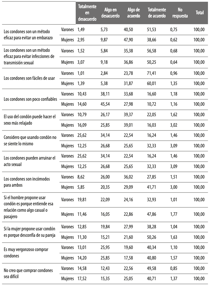 Se puede observar que en los adolescentes conviven, en general, actitudes positivas y negativas hacia el condón y su uso. Por una parte, la mayoría de los adolescentes reconoce al condón como un método eficaz, fácil de adquirir y de usar, pero, al mismo tiempo, la mayor parte de ellos piensa que disminuye las posibilidades de placer al usarlo y asocian su uso a relaciones casuales o de desconfianza en la pareja.
