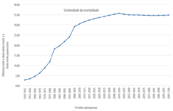 A partir de 2000-2005, a taxa bruta de mortalidade aumenta, intensificando o efeito rejuvenescedor dos óbitos. É preciso cautela para interpretar esse resultado, visto que não se espera um aumento no nível geral mortalidade; pelo contrário, os ganhos de longevidade serão contínuos até 2100. A explicação está no fato de que a taxa bruta de mortalidade depende não apenas das taxas específicas de mortalidade, mas também da estrutura etária da população. Portanto, diante do declínio da mortalidade, pode-se inferir que o aumento da intensidade dos óbitos, medido pela TBM, a partir de 2000, é fruto do próprio processo de envelhecimento populacional. Ao mesmo tempo que o efeito da intensidade dos óbitos fica maior, espera-se que a seletividade da mortalidade continue crescendo, embora em menor ritmo, até o período de 2045 a 2050. A partir desse momento, a seletividade se manterá praticamente constante, visto que a suposição adotada na projeção é de constância da função mortalidade até 2100.