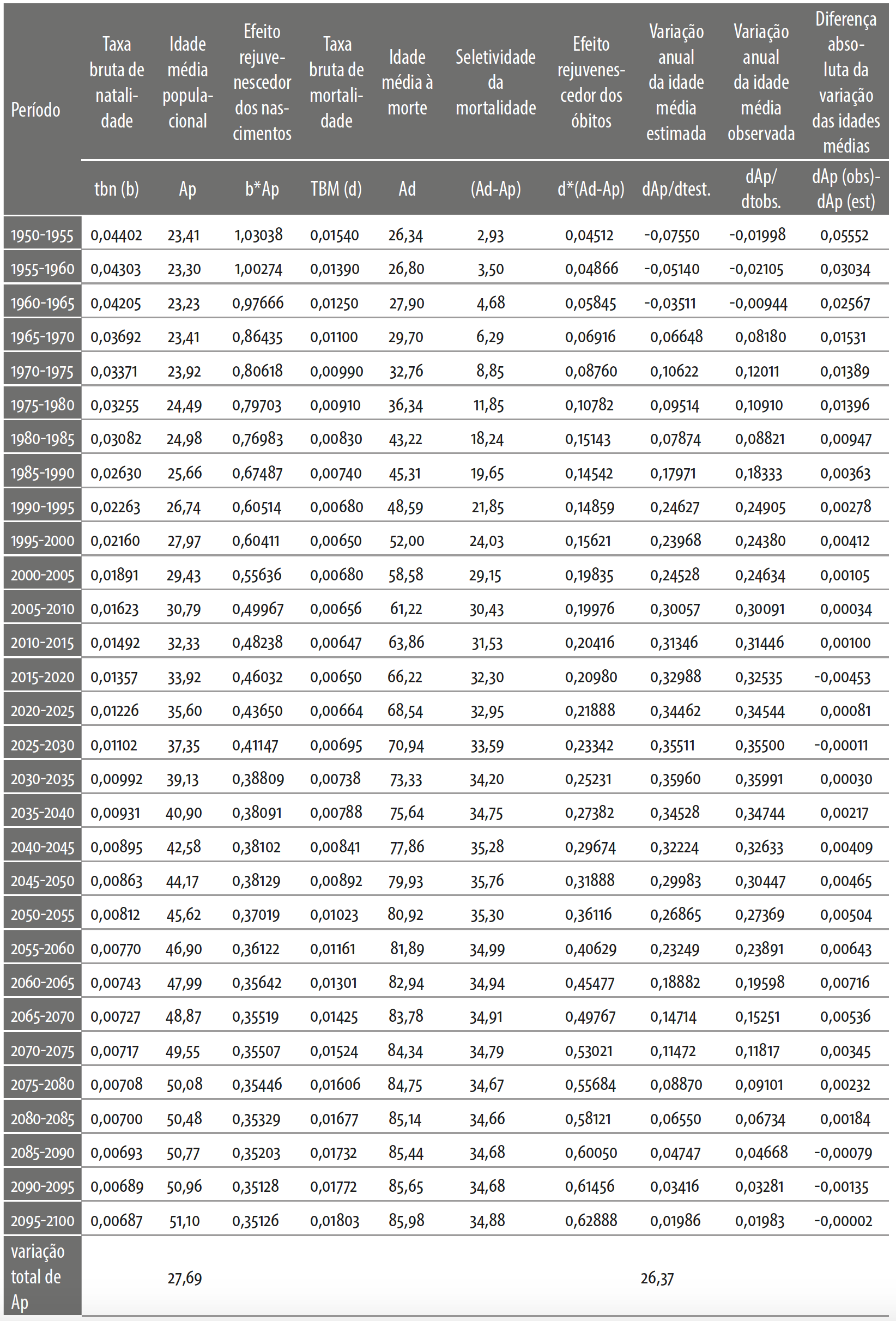 Uma variação nula ou bem próxima de zero na idade média, como a observada em 1950 e projetada para 2100, indica que os efeitos rejuvenescedores combinados dos nascimentos e dos óbitos somam uma unidade e conseguem compensar inteiramente a tendência intrínseca de envelhecimento populacional. Nos demais períodos, quando se registra uma variação positiva ou negativa na idade média da população, esses fatores são insuficientes para compensar tal tendência, o que explica o aumento da idade média de 23,1 anos em 1950 para 51,1 anos em 2100. Vale notar que em 150 anos decorridos entre 1950 e 2100, na ausência de nascimentos e óbitos, a população envelheceria 150 anos (um ano de idade para cada ano calendário decorrido). O efeito compensador dos óbitos e dos nascimentos reduziu o aumento natural da idade média de 150 para 28 anos.