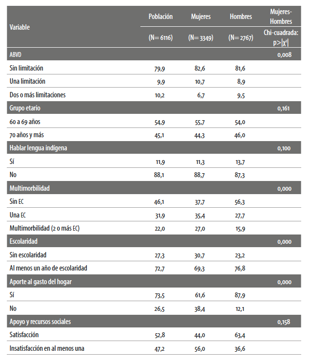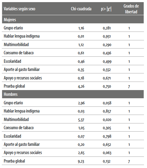 Una de las principales características de esta investigación es que el análisis se estratifica por sexo, pues se considera que la vulnerabilidad social se expresa de manera diferenciada entre mujeres y hombres (Toksanbaeva, 2001; Grundy, 2006) y parte de los resultados encontrados permiten verificar esta hipótesis.