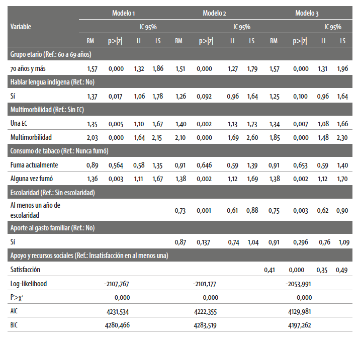 Inicialmente se consideraron como variables predictoras de la dimensión individual: grupo etario, hablar lengua indígena, estado marital, multimorbilidad,[14] índice de masa corporal —imc—[15] y consumo de tabaco; para la dimensión social: acceso a servicios de salud, propiedad de la vivienda, aporte al gasto del hogar, escolaridad, tipo de localidad, y para la dimensión programática: considerarse una persona valiosa, satisfacción con la salud, valoración del vecindario, satisfacción general, satisfacción con las relaciones sociales y satisfacción con la relación con los hijos.