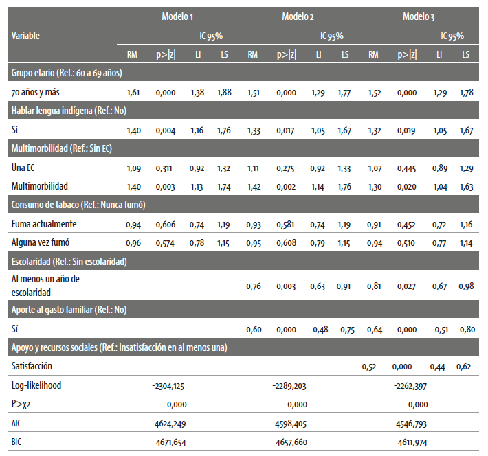 Fuente: elaboración propia a partir de la base de datos de la Ensanut 2012. Nota: p>|z|= Significancia del estadístico de prueba. ic 95%= Intervalo de confianza al 95%. li= Límite inferior, ls= Límite superior.De acuerdo con la tabla 4, el mejor ajuste para los datos de los hombres según los estadísticos aic (4543.440) y bic (4596.769) se da en el modelo 3. Con respecto a la dimensión individual, y ajustando por las variables de la dimensión social y la dimensión programática, se observa que características de la vulnerabilidad social como la edad avanzada, hablar lengua indígena o la multimorbilidad son factores que se asocian con mayores probabilidades de tener algún grado de dependencia funcional. Para las variables de la dimensión social, y controlando por la dimensión individual y la dimensión programática, entre los hombres tener algún año de escolaridad y aportar al gasto del hogar son factores que se asocian con menores probabilidades de tener alguna limitación en las abvd. En cuanto a la variable relacionada con la dimensión programática, y una vez ajustada por las dimensiones individual y social, se encuentra que, comparados con los hombres que declararon al menos una insatisfacción, estar satisfecho con el apoyo y soporte social estimados se asocia con menores probabilidades de tener algún grado de dependencia funcional.