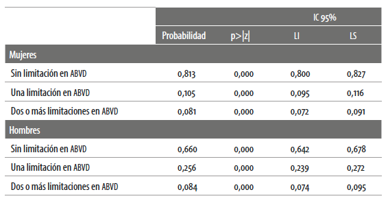 Fuente: elaboración propia a partir de la base de datos de la Ensanut 2012. Nota: p>|z|= Significancia del estadístico de prueba. IC 95%= Intervalo de confianza al 95%. LI= Límite inferior, LS= Límite superior.Finalmente, en la tabla 5 se presenta el resumen de las probabilidades estimadas para mujeres y hombres de sesenta años y más de presentar algún grado de limitación en el desarrollo de las abvd. Como puede verse, existen diferencias en las probabilidades de presentar dependencia funcional ajustando por las variables de la vulnerabilidad social. En este sentido, los hombres presentan una menor probabilidad de no tener dependencia funcional pero mayores probabilidades de tener una limitación o dos o más limitaciones en el desarrollo de abvd que las mujeres.
