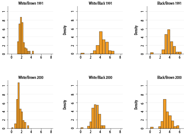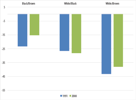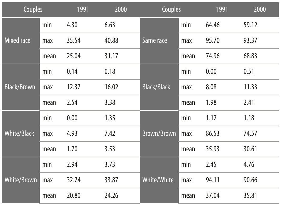 The changes over time (1991–2000) were not the same for all groups. Considering the average proportion, same race couples decreased from 74.96 percent in 1991 to 68.83 percent in 2000. Brown/brown and white/white couples decreased to 14.81 percent and 3.33 percent respectively. However, the average proportion of black/black couples increased to 21.4 percent. The proportions of all mixed race couples increased-white/black (107.38 percent); followed by black/brown (33.22 percent); and white/brown (only 16.63 percent).