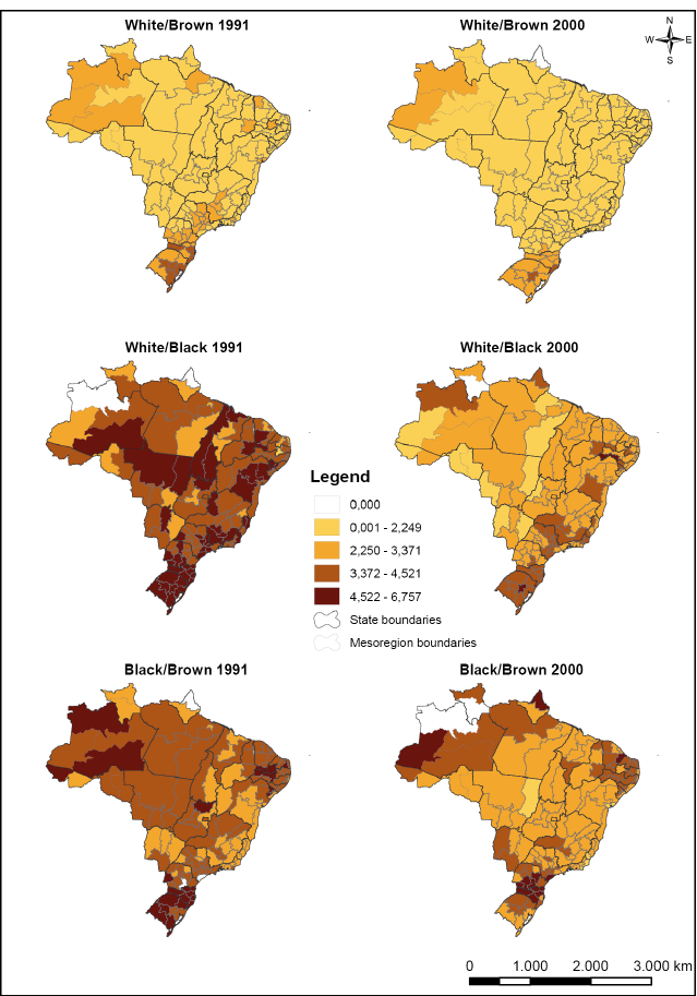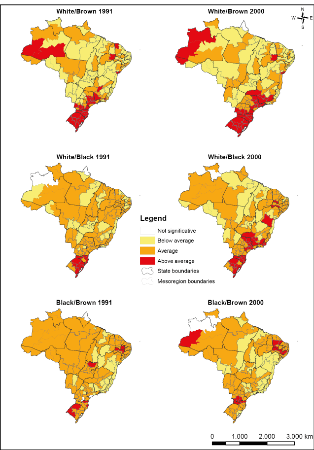The analysis of the homogamy-heterogamy rates by mesoregion showed that, with very few exceptions, the consideration of the local racial distribution is important when evaluating local homogamy-heterogamy rates. There are also significant differences throughout the country. This means that there are notable regional differences, other than just racial composition, for explaining variation in intermarriage levels in Brazil. The South region stands out because that is where the homogamy-heterogamy rates are higher for any type of racial combination and for both periods, this result corroborates with the hypothesis that in the South, where there is a concentration of whites the social distance between whites and blacks and whites and browns are higher.